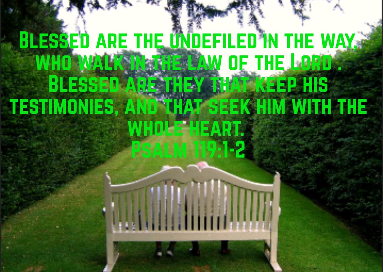 Blessed are the undefiled 1 in the way who walk in the law of the Lord. 2 Blessed are they that keep his testimonies and that seek. 1 Blessed are the undefiled in the way who walk in the law of the LORD.